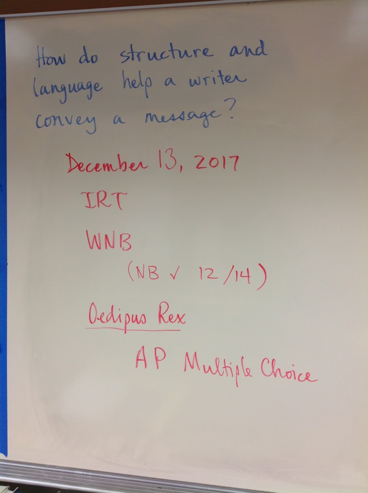We continued looking at AP-style multiple choice questions, reading excerpts from Oedipus Rex today. I reminded students not to be discouraged if they're not getting every question right--the work we're doing right now is just practice for when it will count next year if they take AP and in the future when they take the PSAT, SAT, or ACT.